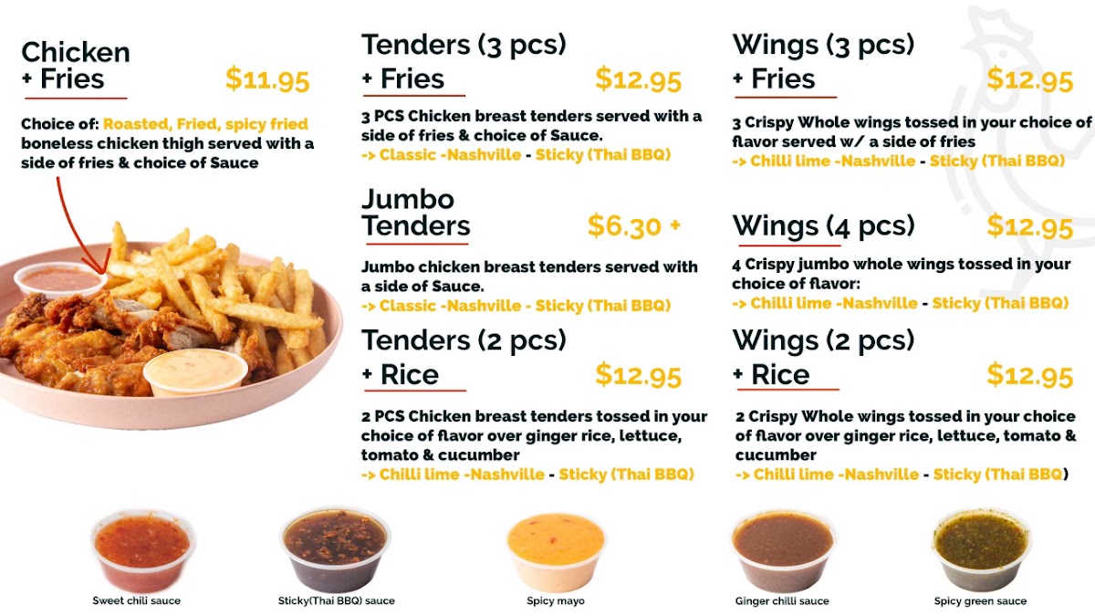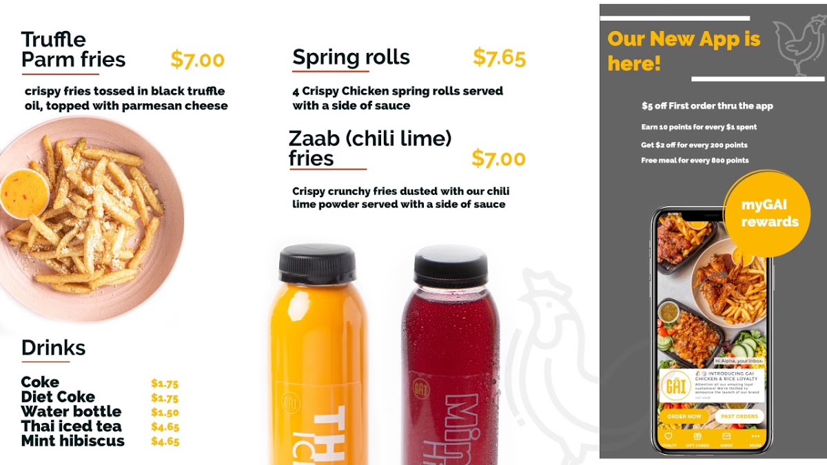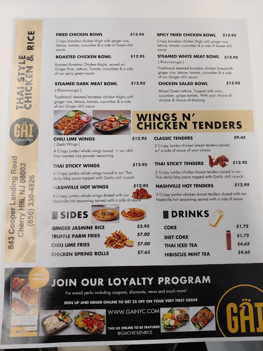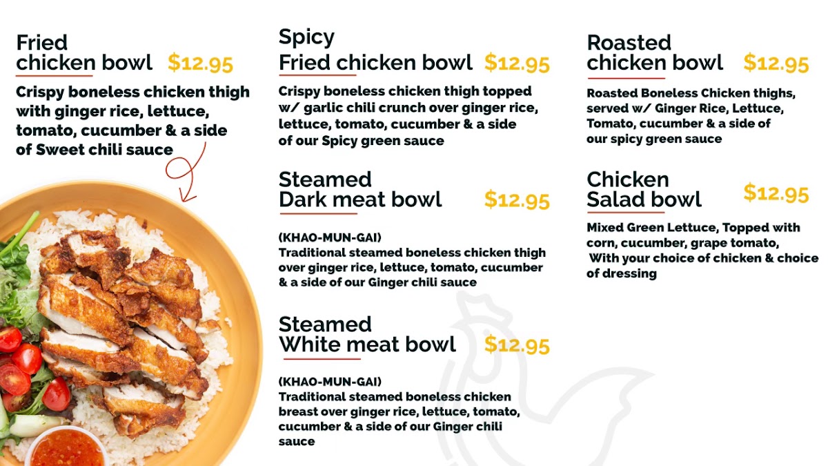 From a reviewer’s perspective, the menu at Gai Chicken & Rice delivers a focused yet satisfying variety centered on chicken in multiple styles and formats. The FRIED CHICKEN BOWL, ROASTED CHICKEN BOWL, and SPICY FRIED CHICKEN BOWL stand out as hearty staples, while lighter options like the STEAMED DARK MEAT BOWL and STEAMED WHITE MEAT BOWL provide balance. The salad section, including the FRIED CHICKEN SALAD and SPICY CHICKEN SALAD, offers fresh alternatives without sacrificing flavor. For larger appetites, platters such as the STICKY TENDER PLATTER and STICKY WINGS PLATTER showcase bold Thai-inspired flavors, complemented by wings and tenders like ZAAB (chili lime) WINGS and STICKY (Thai bbq) TENDERS. Combo meals like FRIED CHICKEN + FRIES and ZAAB WINGS + FRIES add value and convenience, while newer additions such as the CLASSIC CHICKEN SANDWICH and CLASSIC CHICKEN SANDWICH COMBO broaden the appeal. Sides and extras, including TRUFFLE PARM FRIES and sauces like SPICY GREEN SAUCE and SWEET CHILI SAUCE, enhance customization. Overall, the menu feels cohesive and flavorful, emphasizing quality chicken dishes with diverse preparations to suit different preferences.