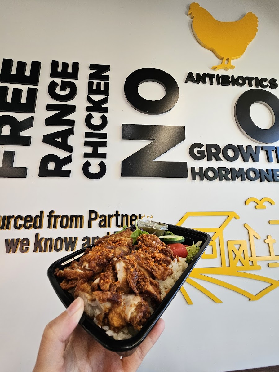 Crispy boneless chicken thigh with ginger rice, your choice of toppings & choice of side sauce